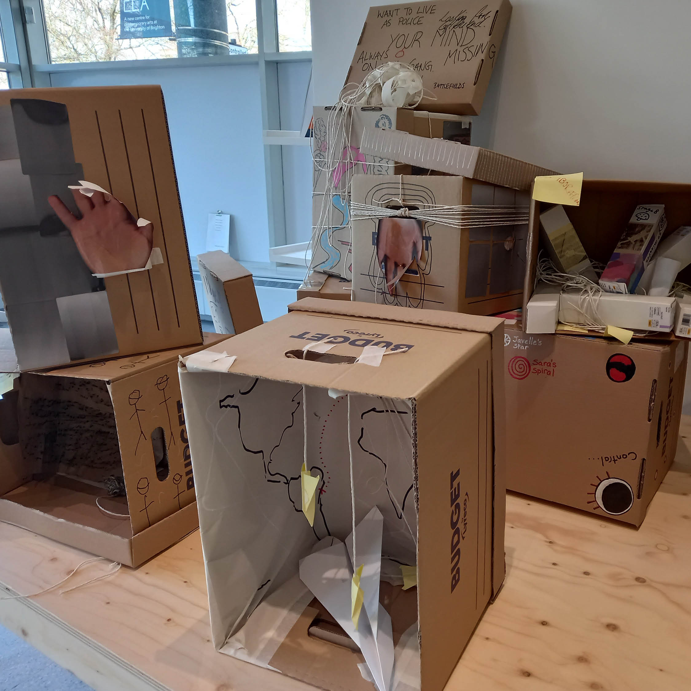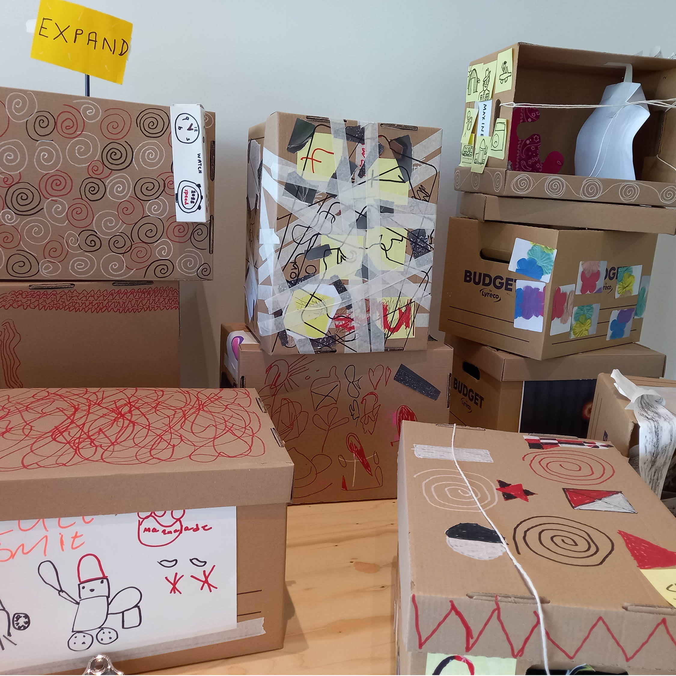 The group decided to make boxes because they can contain, store and transport objects and materials, just like the shipping containers in the gallery. The boxes were much smaller than the shipping containers!